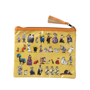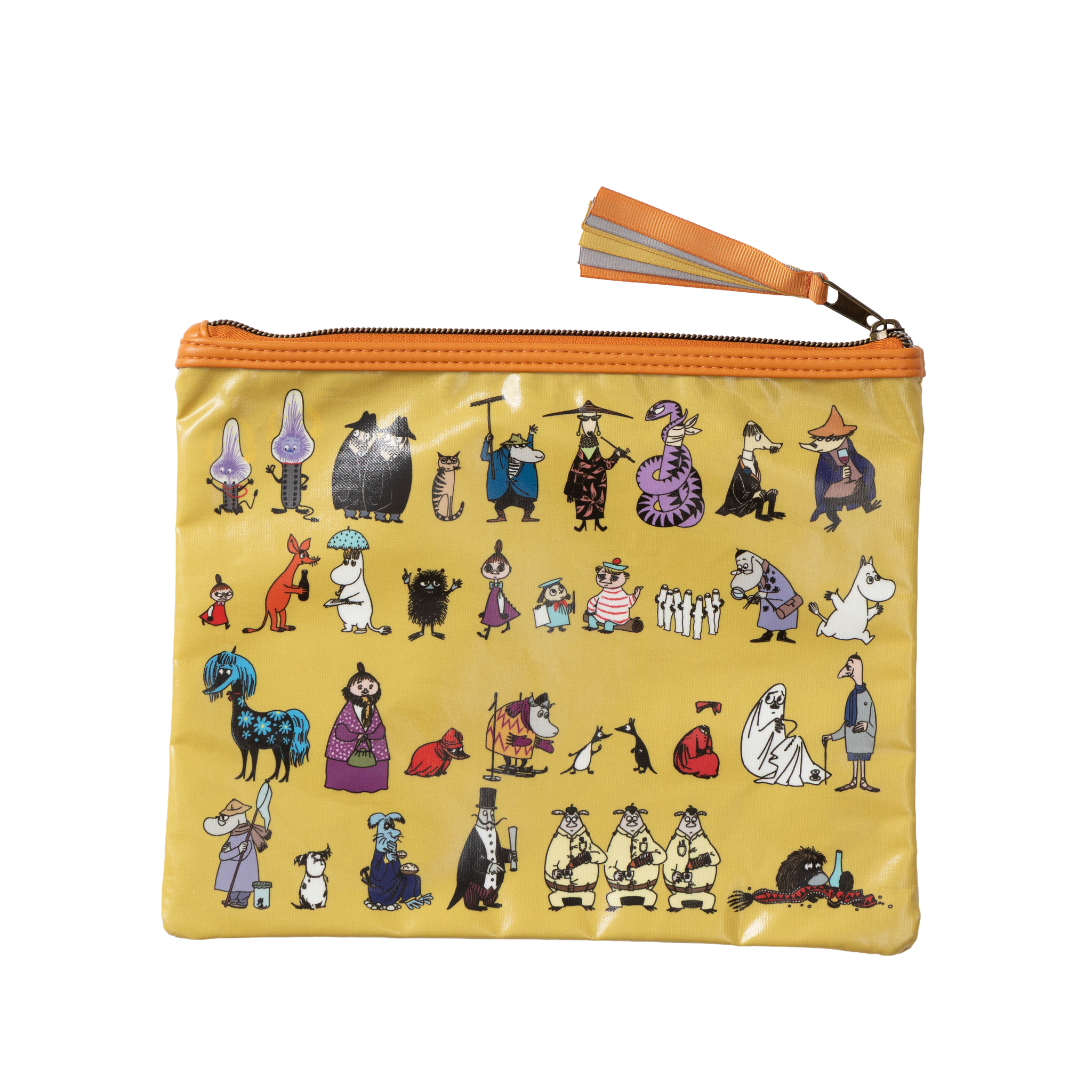 ムーミン80周年を記念した、キャラクターがいっぱいのにぎやかなデザインのフラットポーチです。