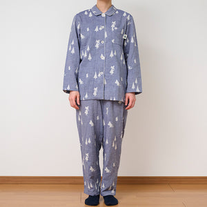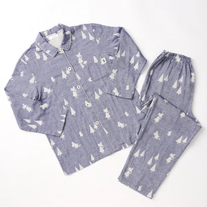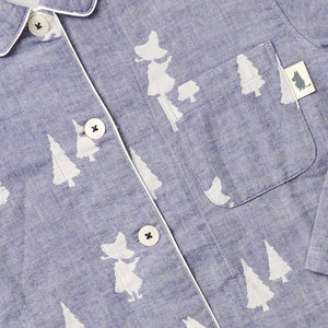 フィンランドの森を思わせる木々の中にムーミン、スナフキン、リトルミイの姿をちりばめたデザインを、素朴で繊細な播州織のジャガードで表現したパジャマ上下セットです。