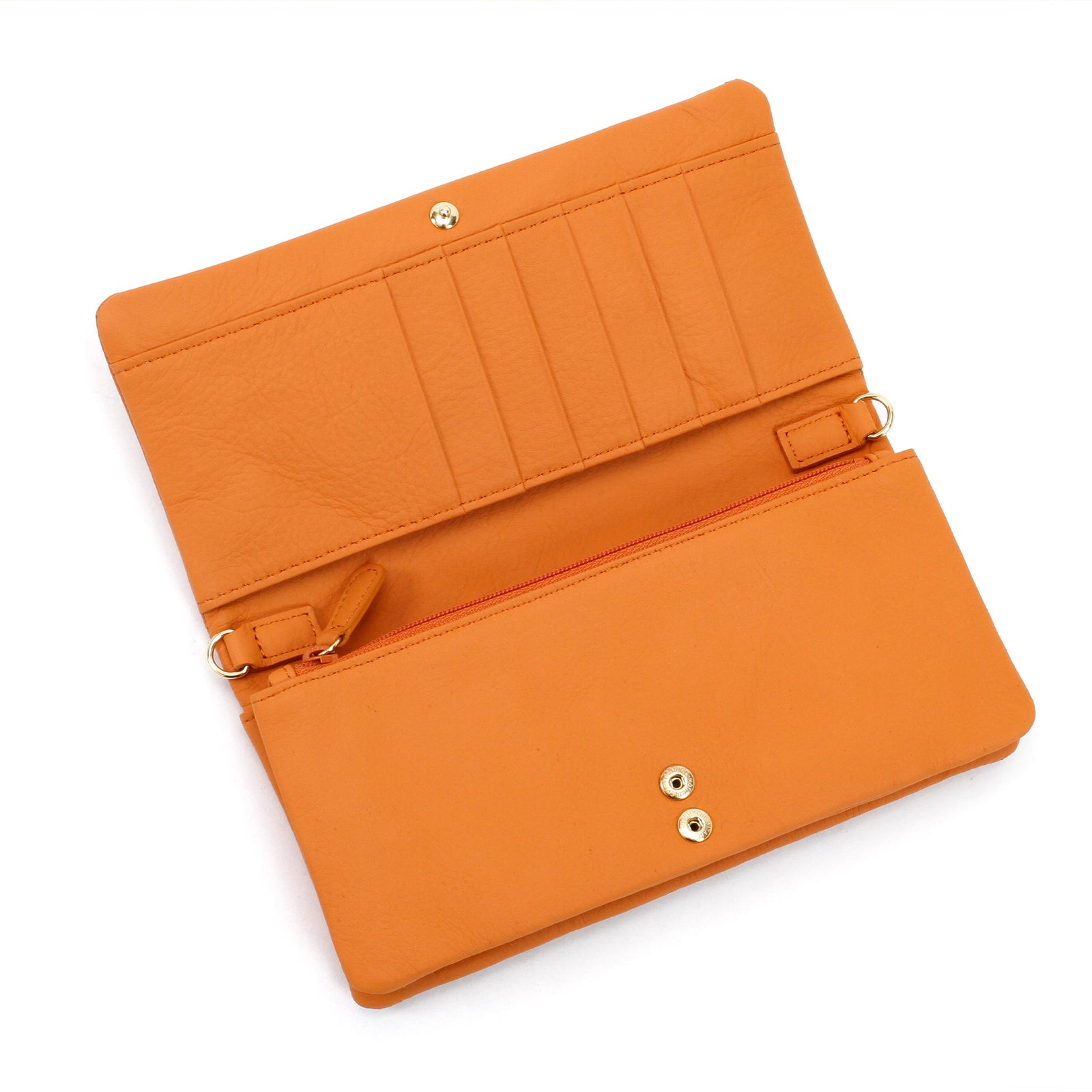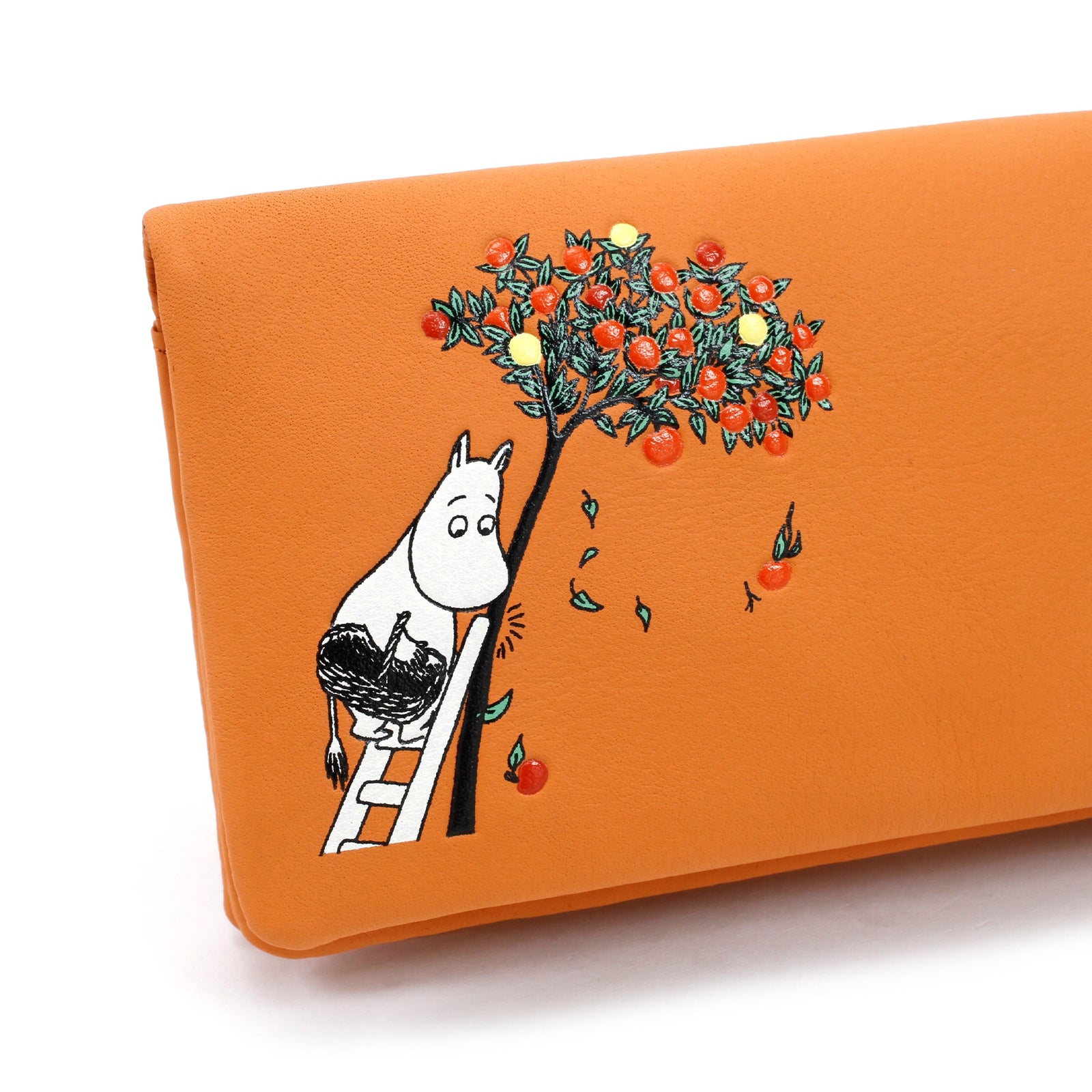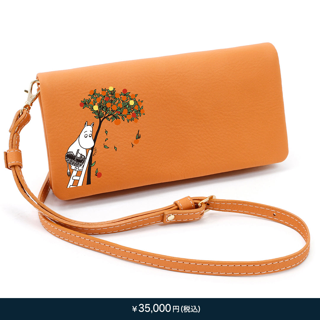 This bi-fold wallet with an impressive art of Moomin harvesting apples is made of soft cowhide leather and has plenty of storage space for cards. It has a double hook design that allows you to adjust the cover position in two stages, so you can rest assured even when the contents have increased. If you attach a removable shoulder strap, you can use it like a pochette, making it very convenient for small purchases.