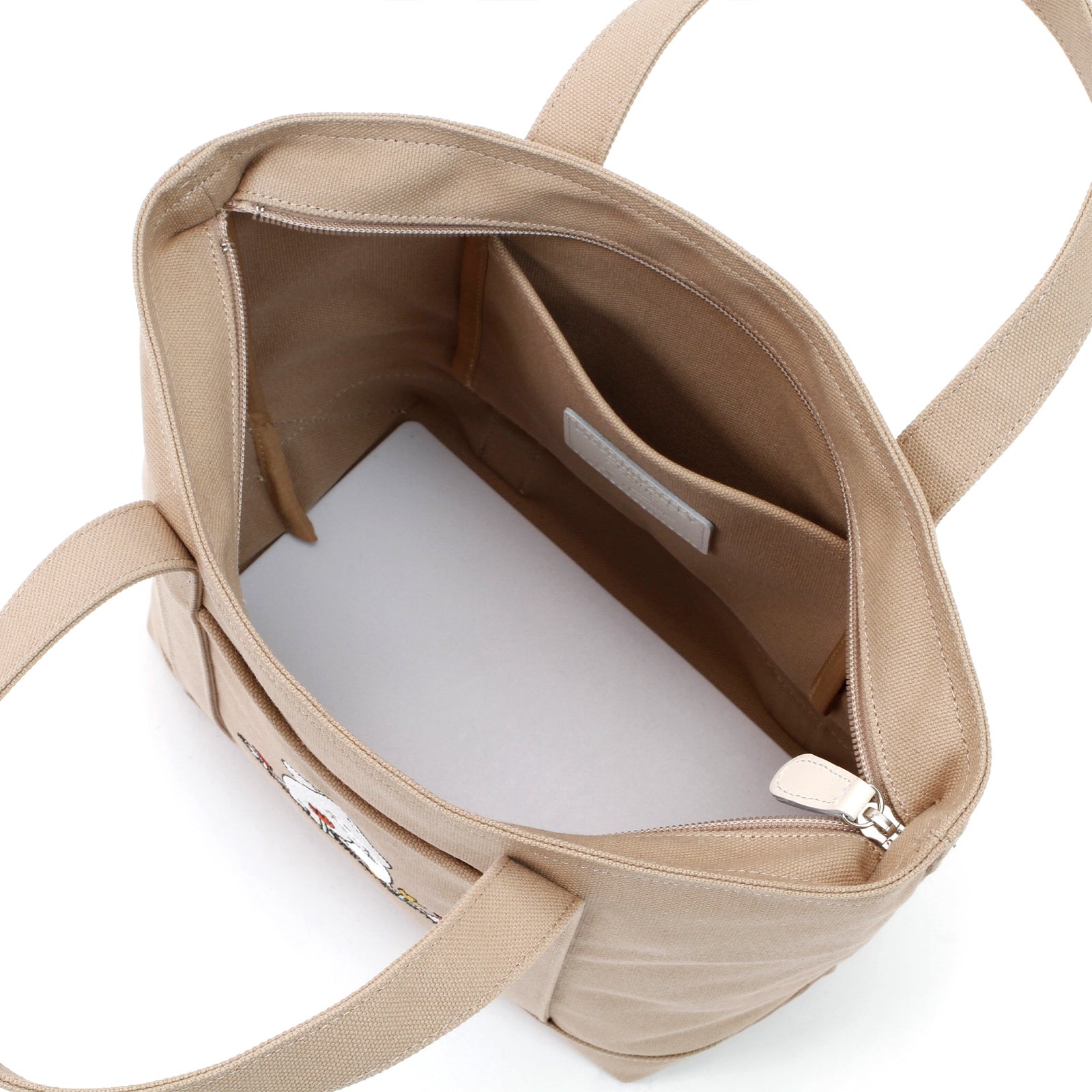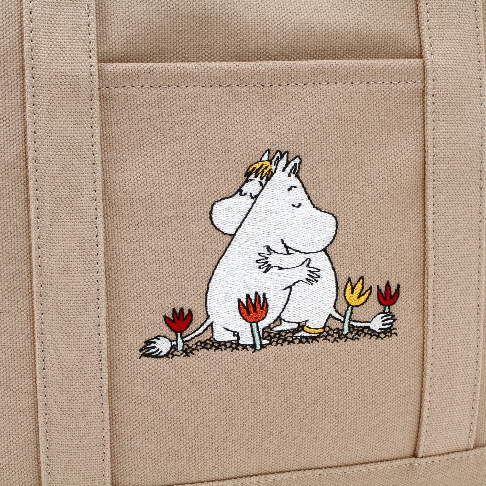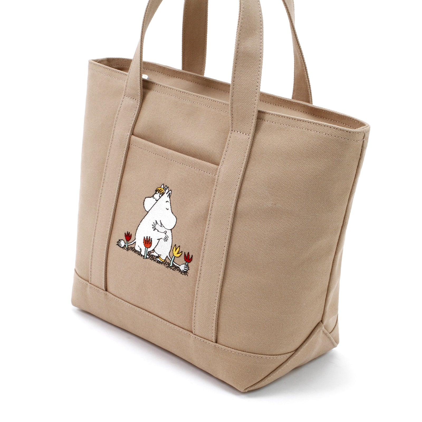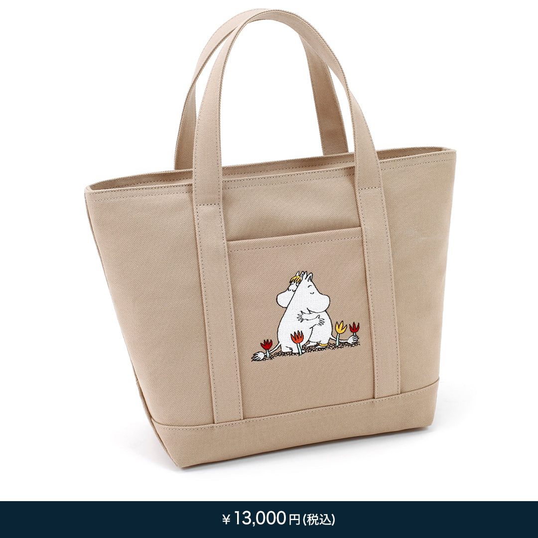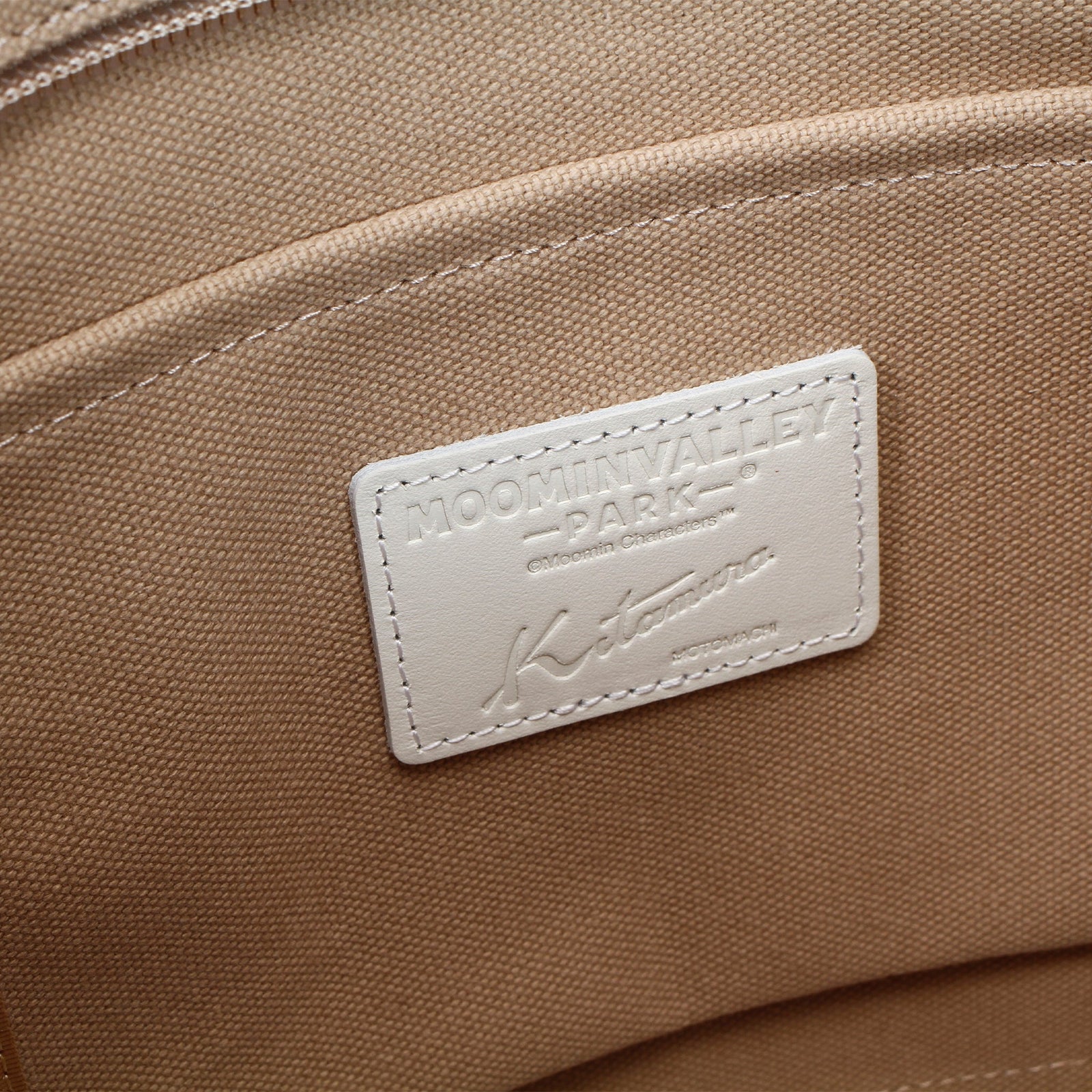 A canvas tote bag with a carefully embroidered image of Moomin and Snoke hugging each other. It has an outer pocket that can hold small items such as a pass case or smartphone, and although it is simple, it has a design that shows the particularity of Kitamura. Made of sturdy canvas fabric and comes with a bottom plate, it is extremely comfortable to use. It can be used for a wide range of purposes, from everyday life to short outings.