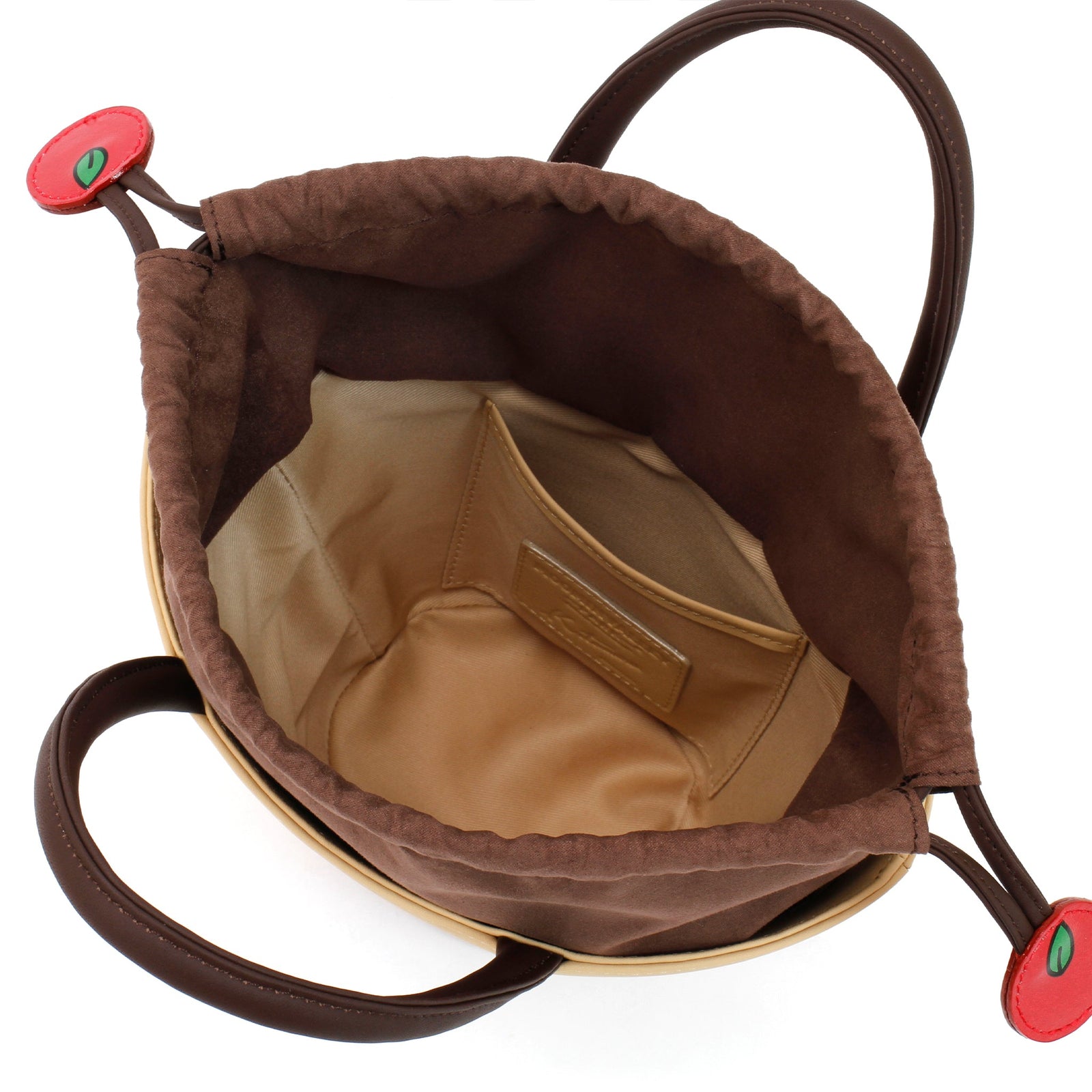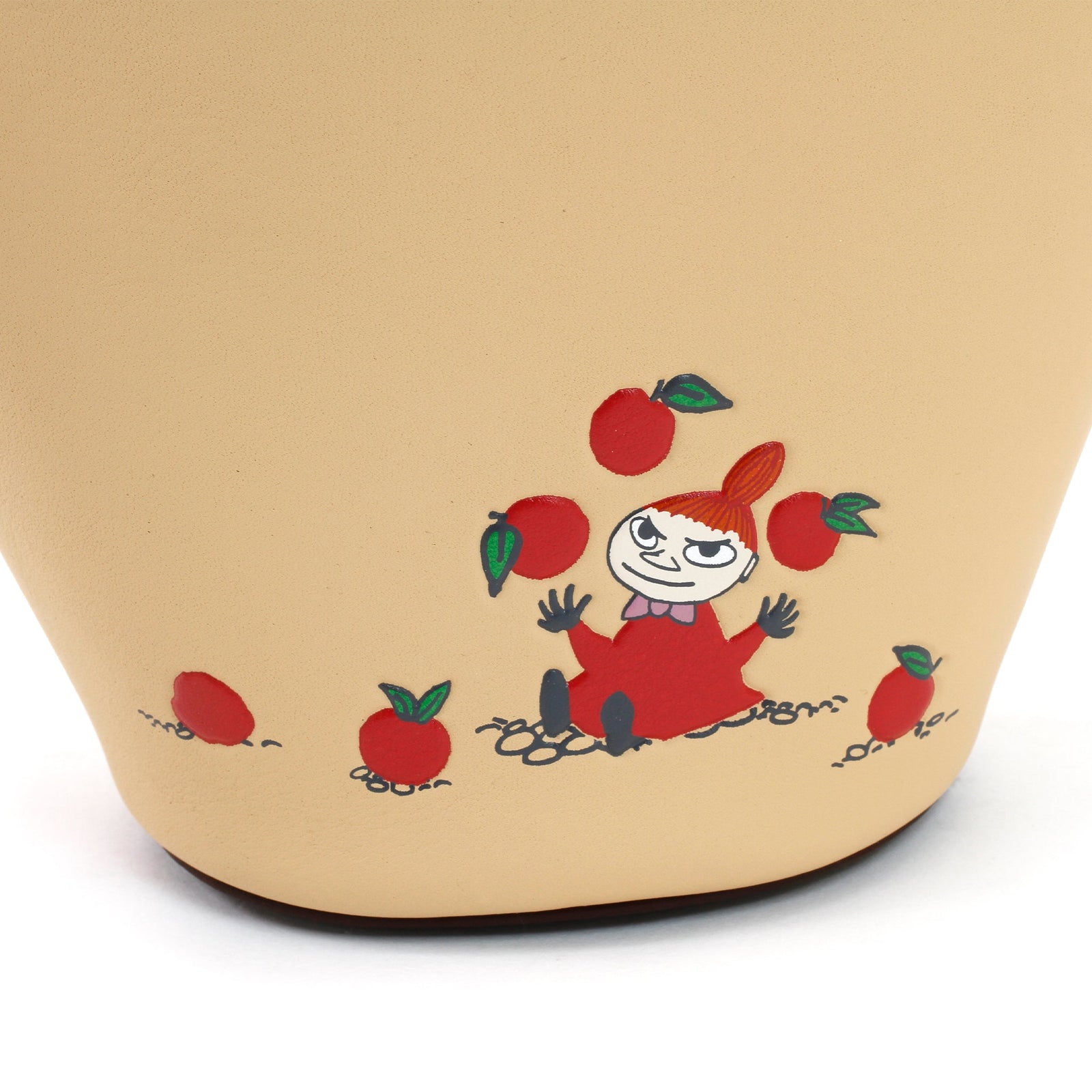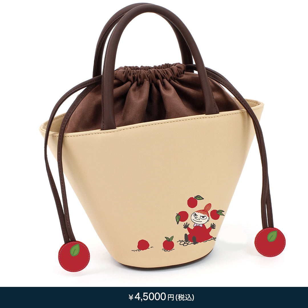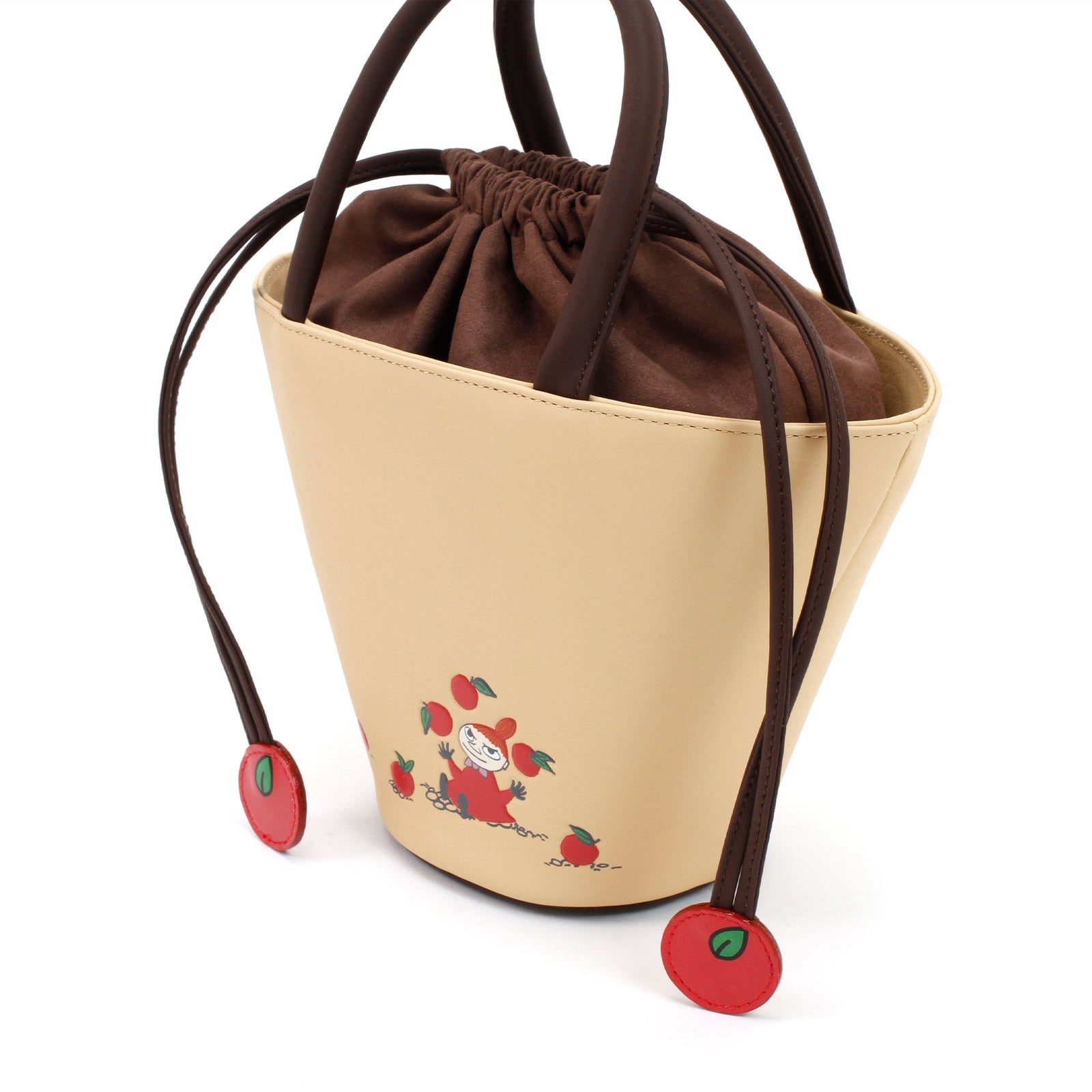 A cute bucket-shaped handbag featuring Little My playing beanbags with apples. If you tie the drawstring string, which features an apple motif, the contents will not be visible or fall out. The material is cowhide, and the design has an attractive balance of luxury and playfulness.