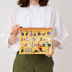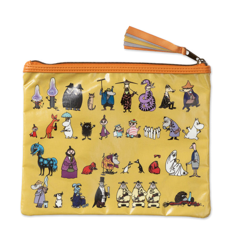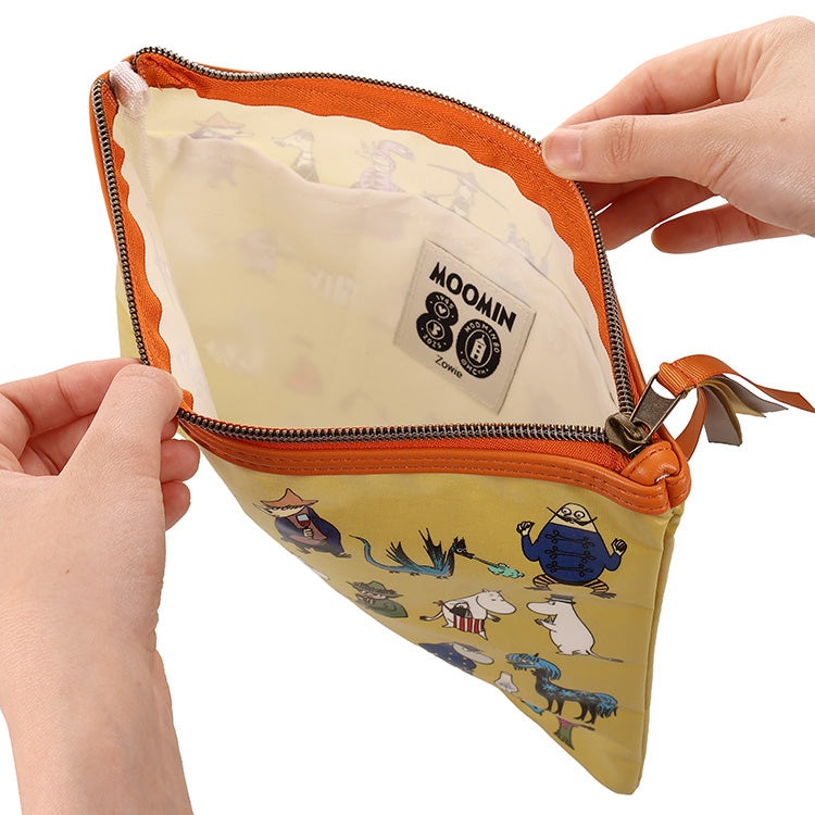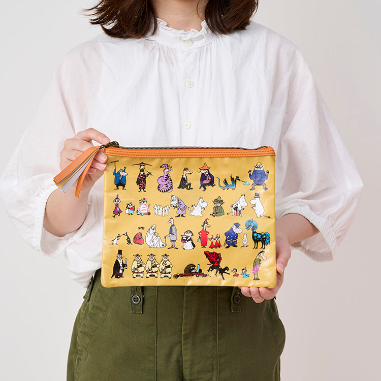 ムーミン80周年を記念した、キャラクターがいっぱいのにぎやかなデザインのフラットポーチです。
