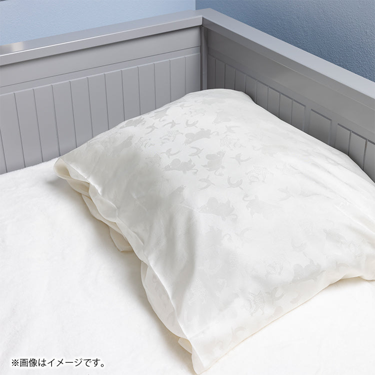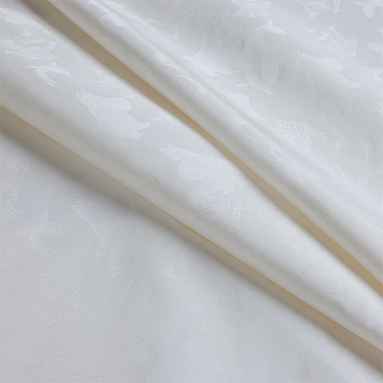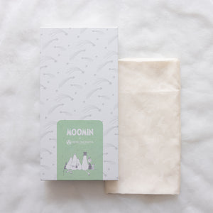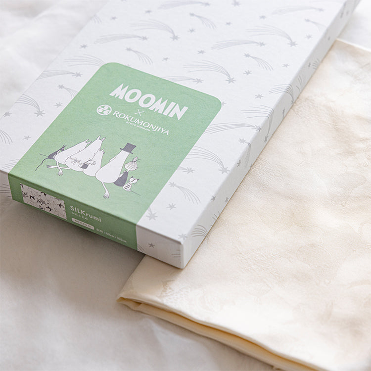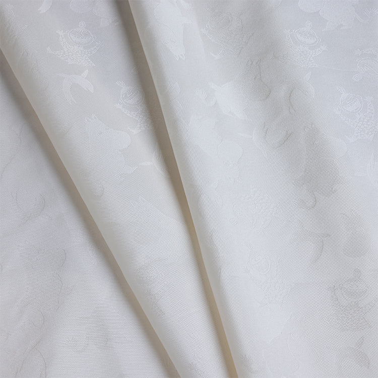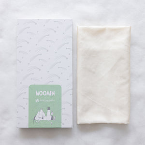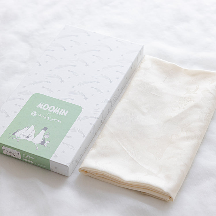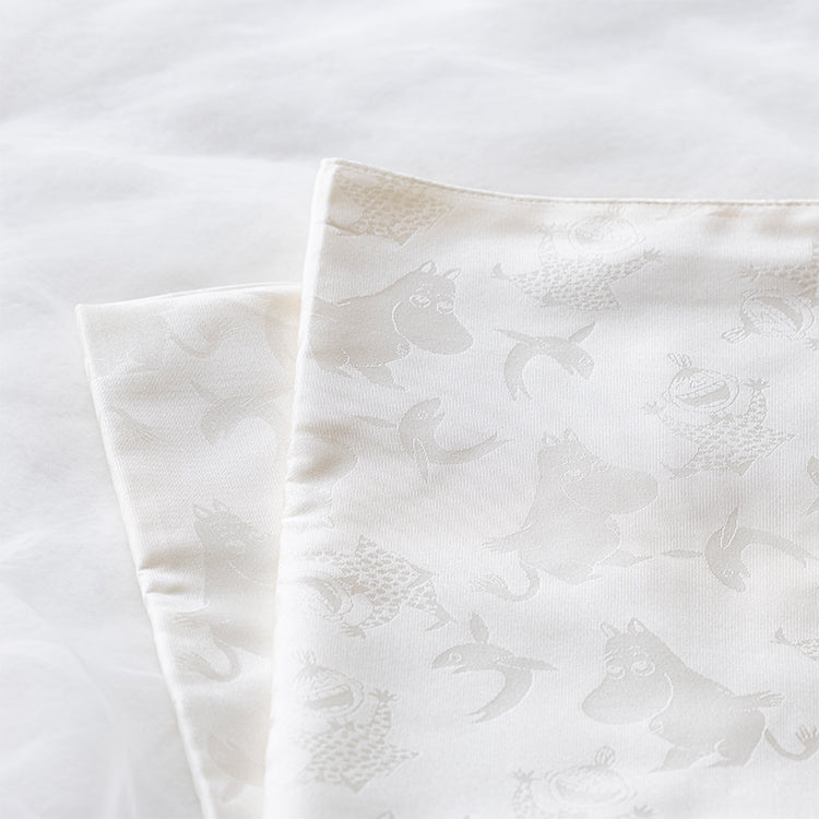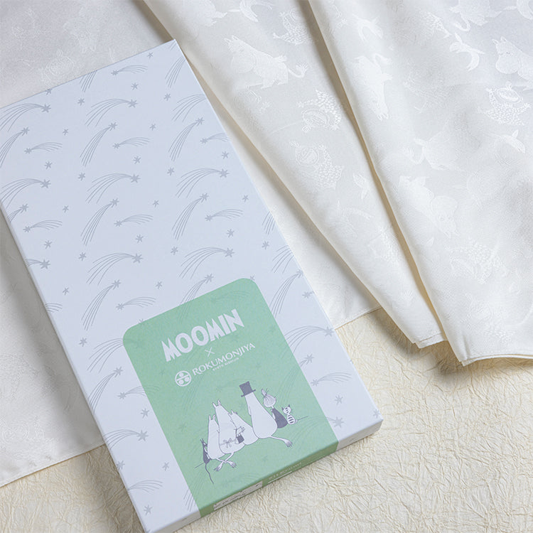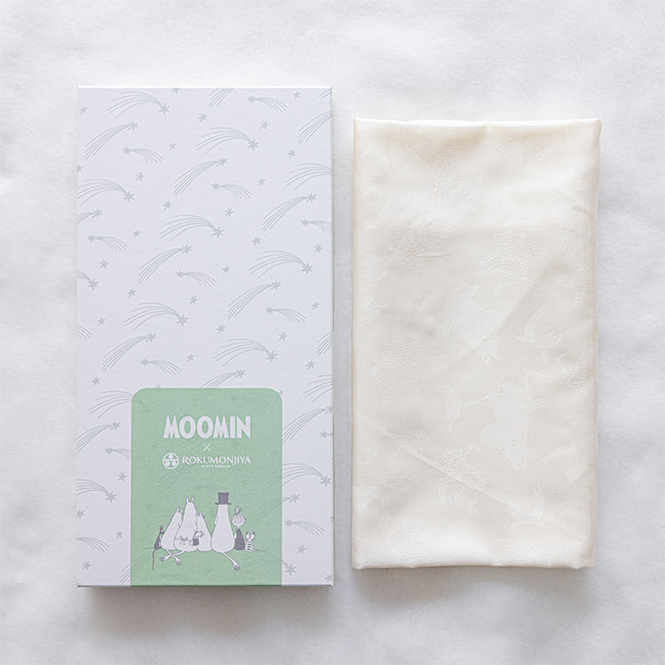 艶やかな白さを引き立てるムーミンキャラクターの地紋が美しい、シルク100%のおくるみです。