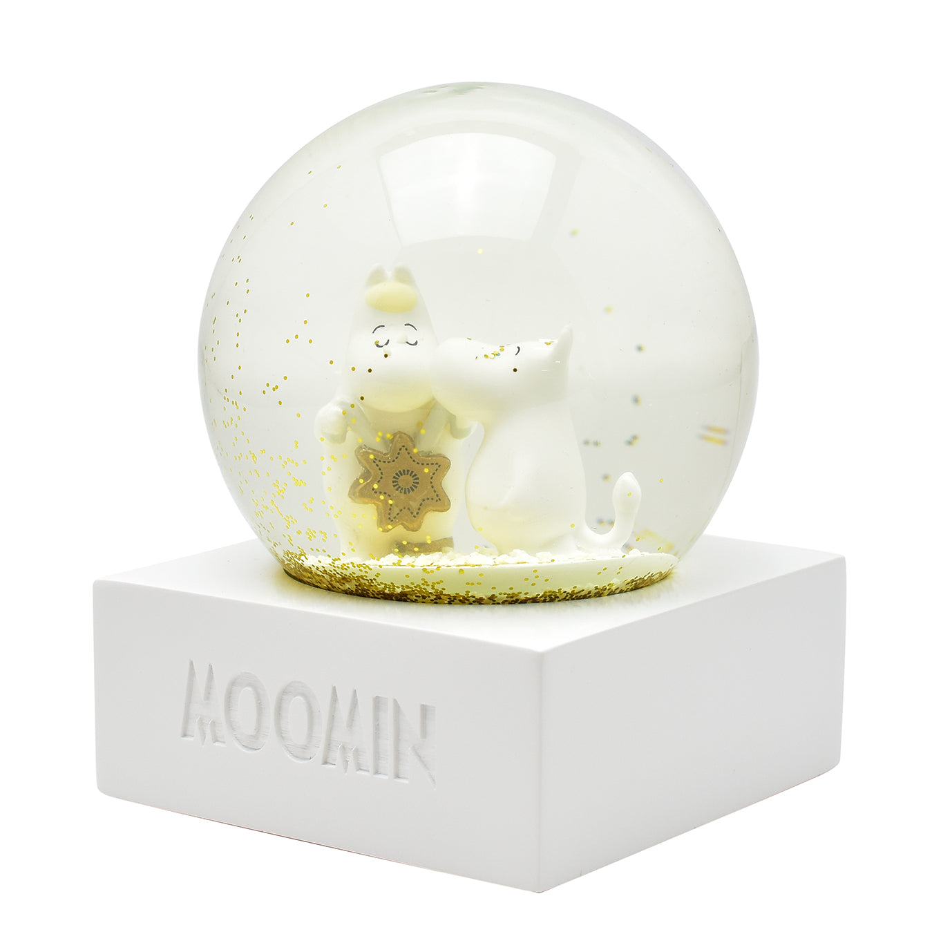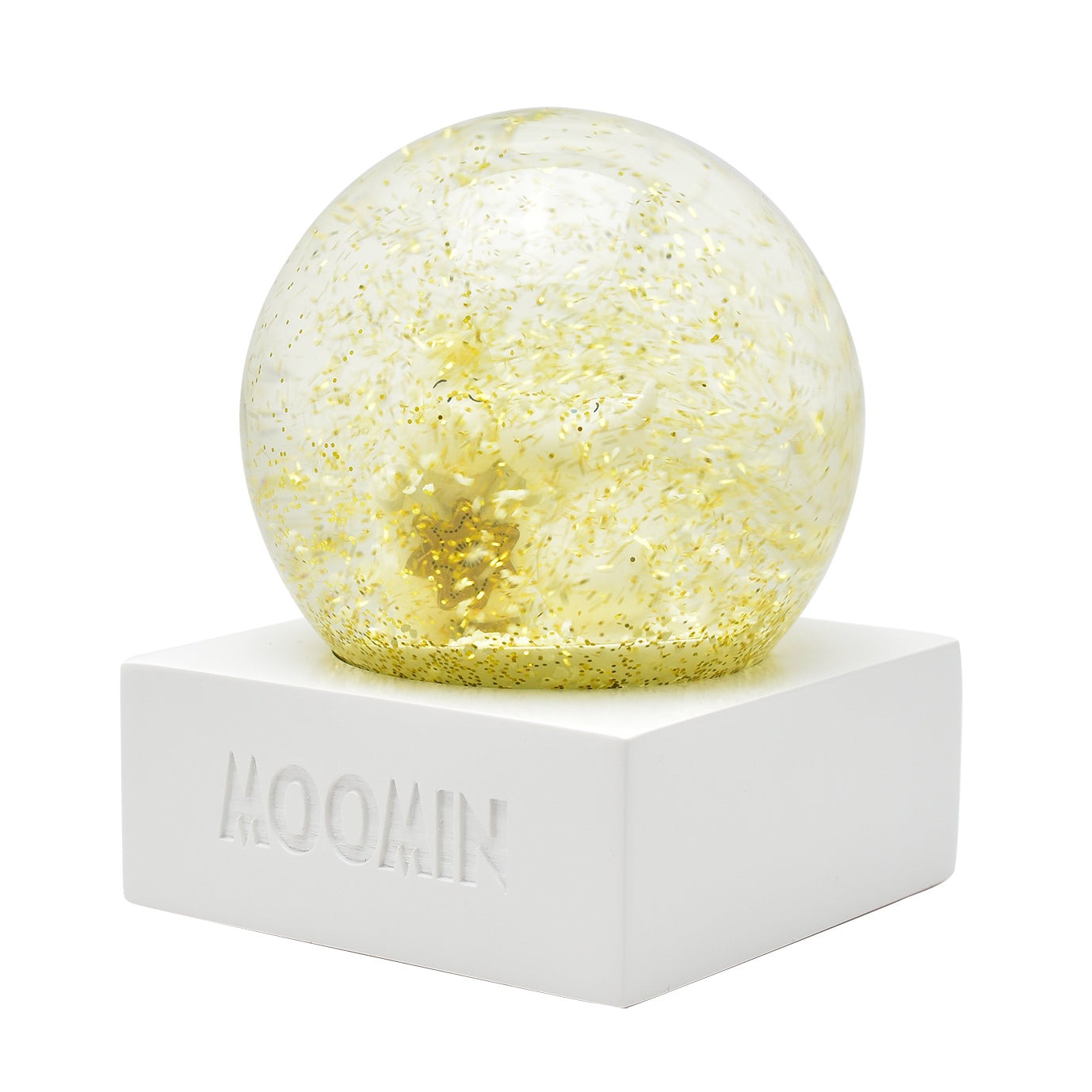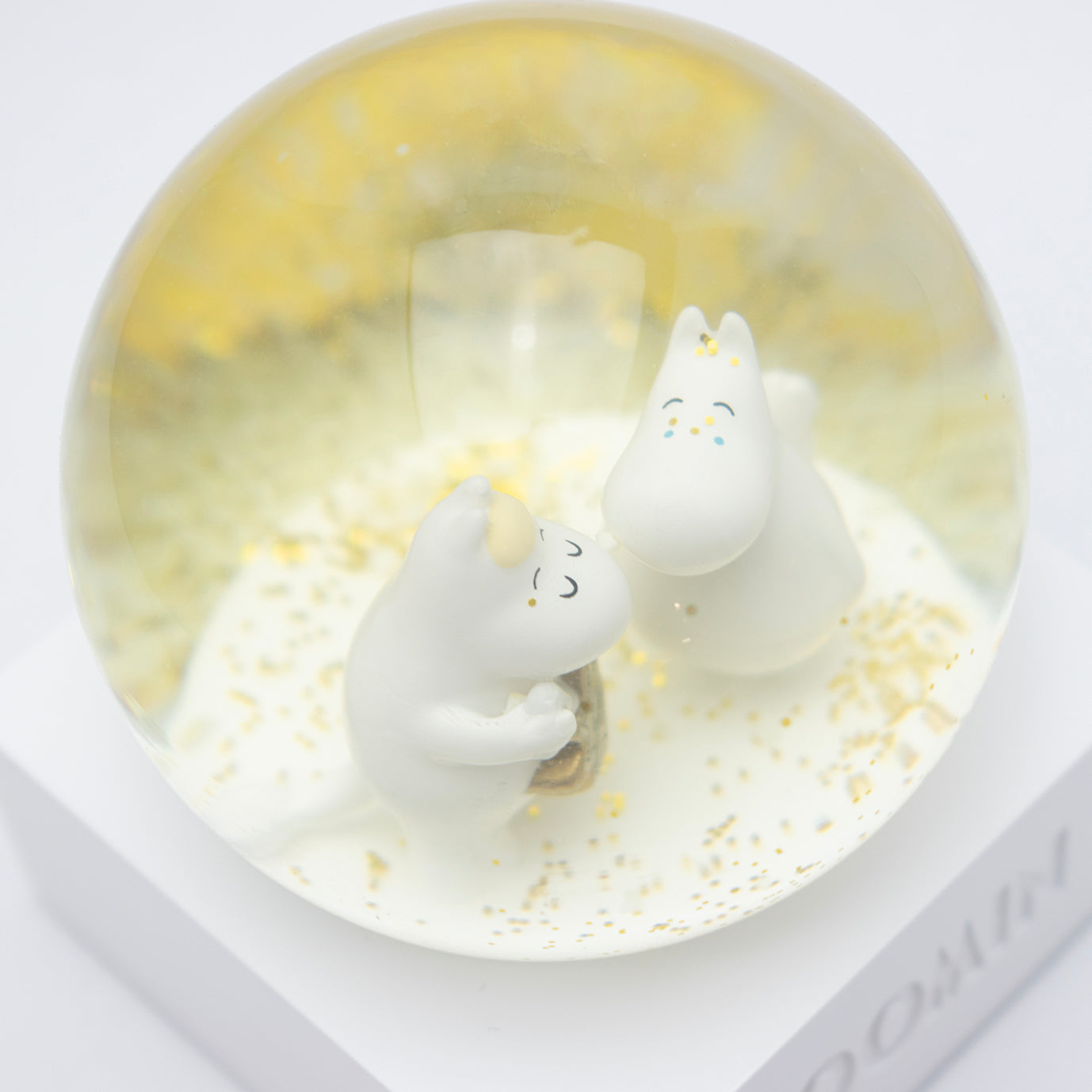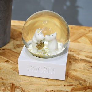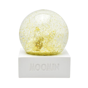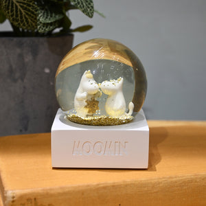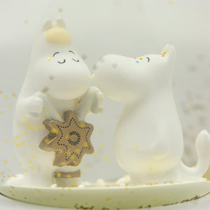 ドームをそっと揺らすと、ムーミンとスノークのおじょうさんのまわりにゴールドのグリッターがきらめきながら舞い上がり、物語の世界がふんわり広がります。