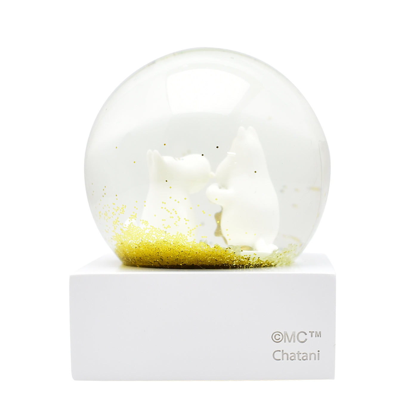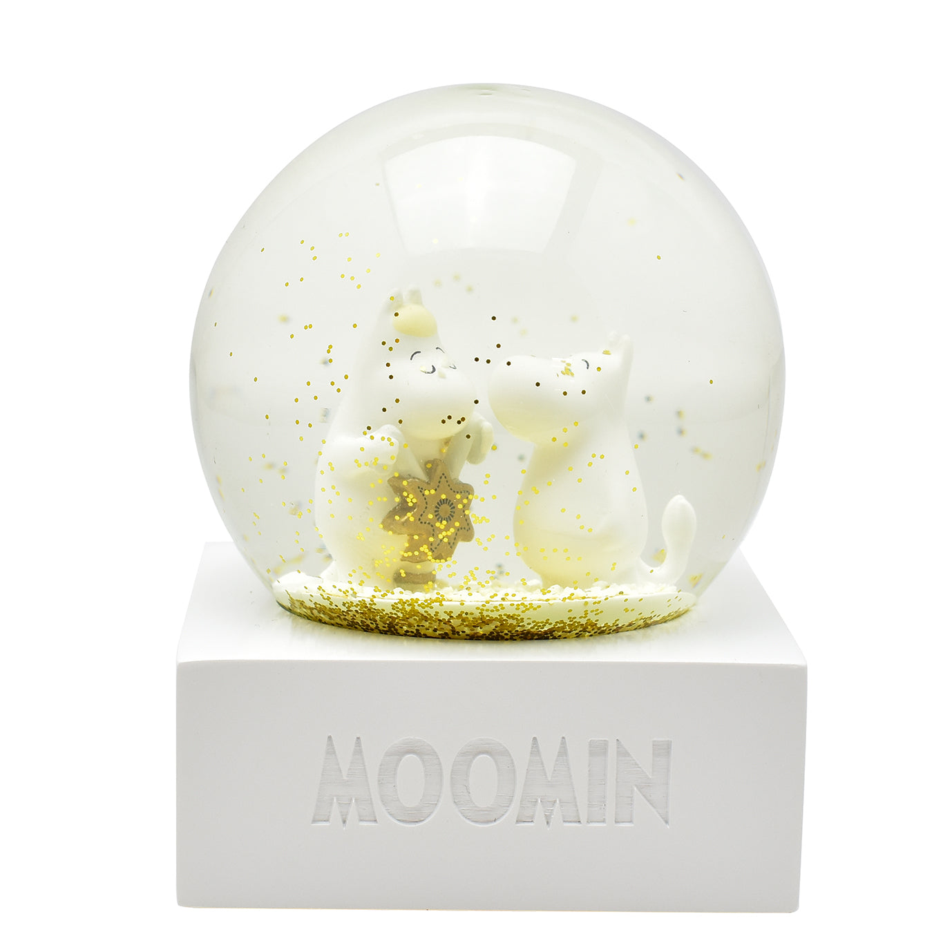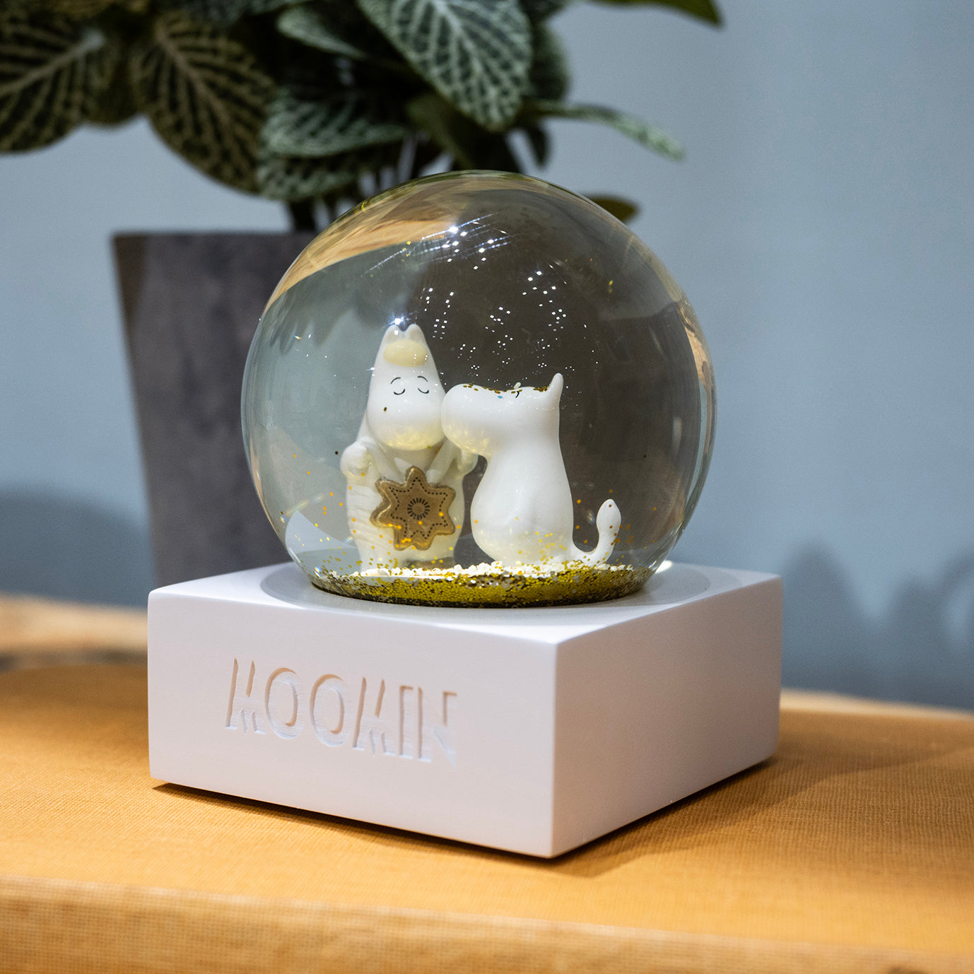 ドームをそっと揺らすと、ムーミンとスノークのおじょうさんのまわりにゴールドのグリッターがきらめきながら舞い上がり、物語の世界がふんわり広がります。