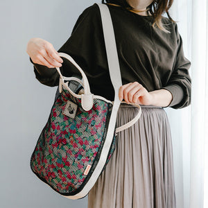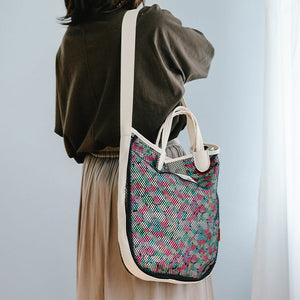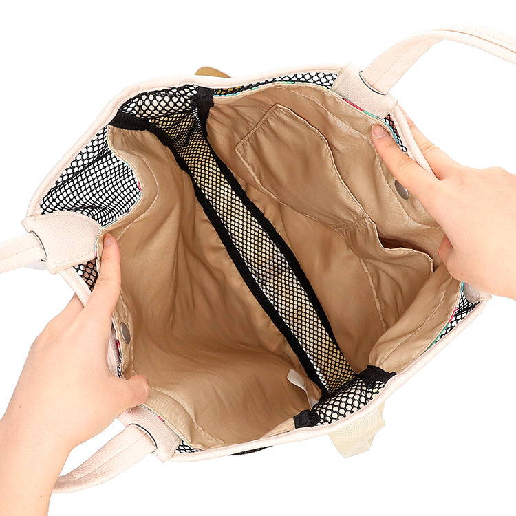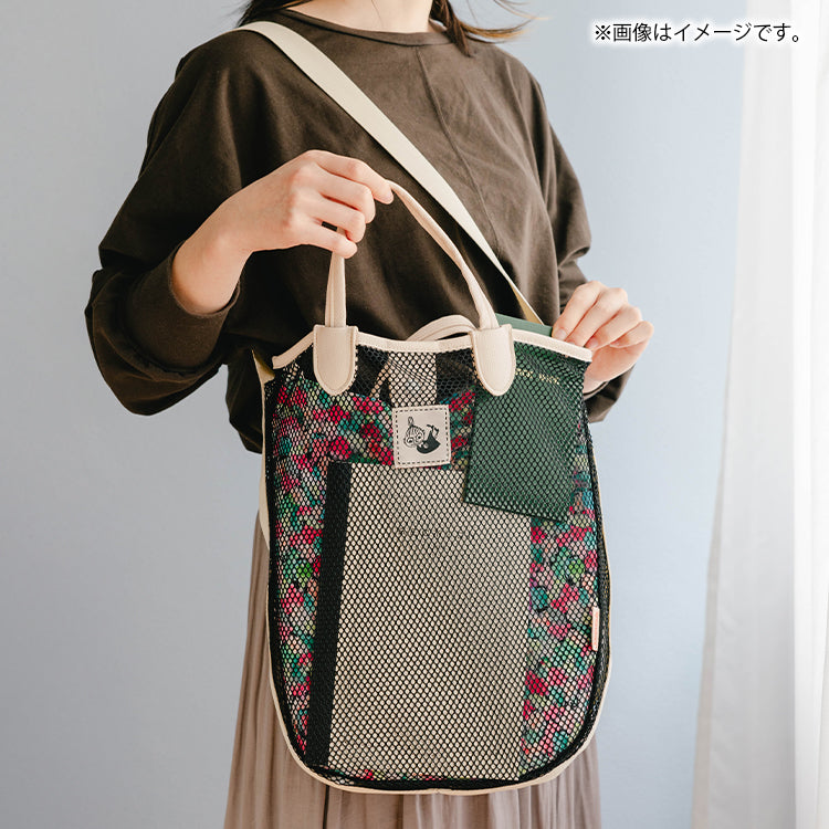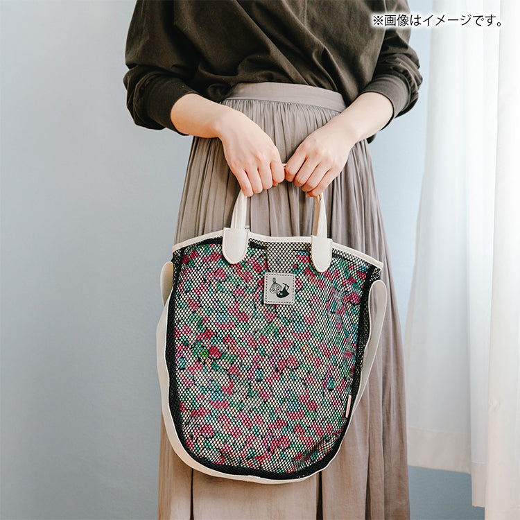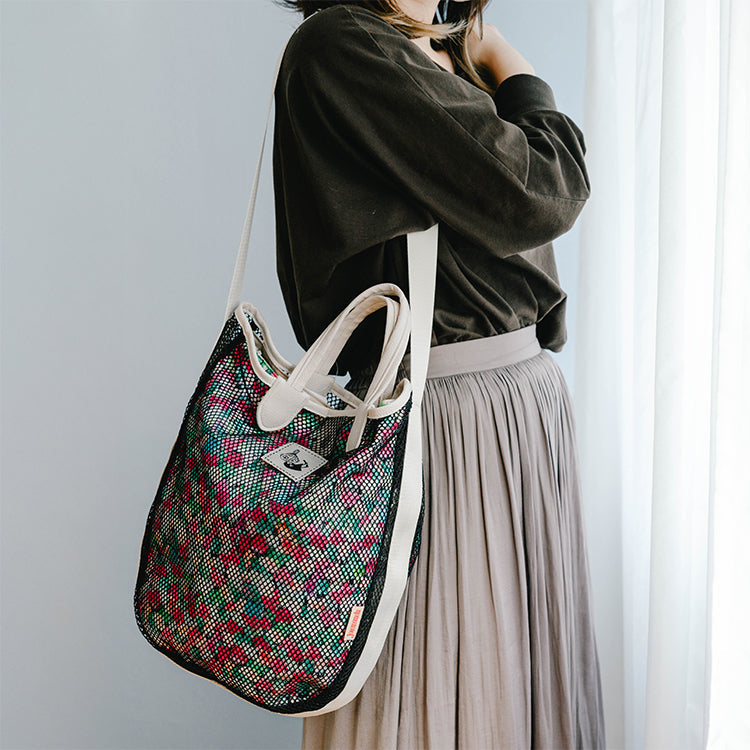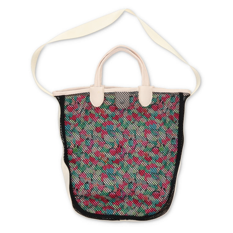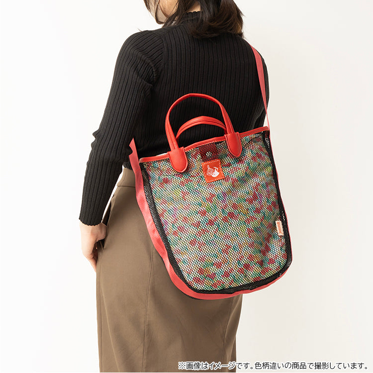 这款时尚的手提包采用网状设计和 JOCOMOMOLA 鲜艳的整体图案。